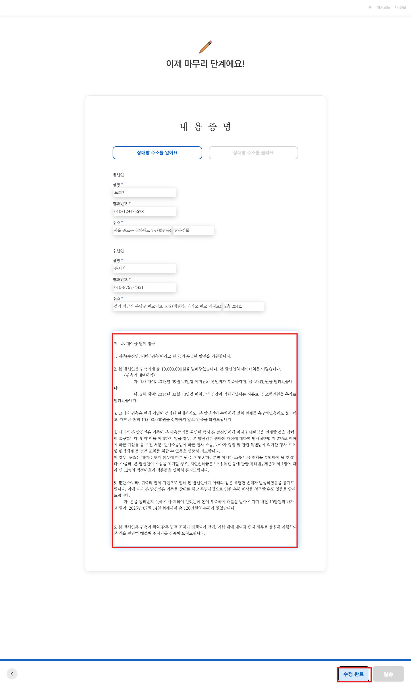 - 전자 내용증명: 결제 즉시 발송되므로 취소 및 환불이 불가합니다.