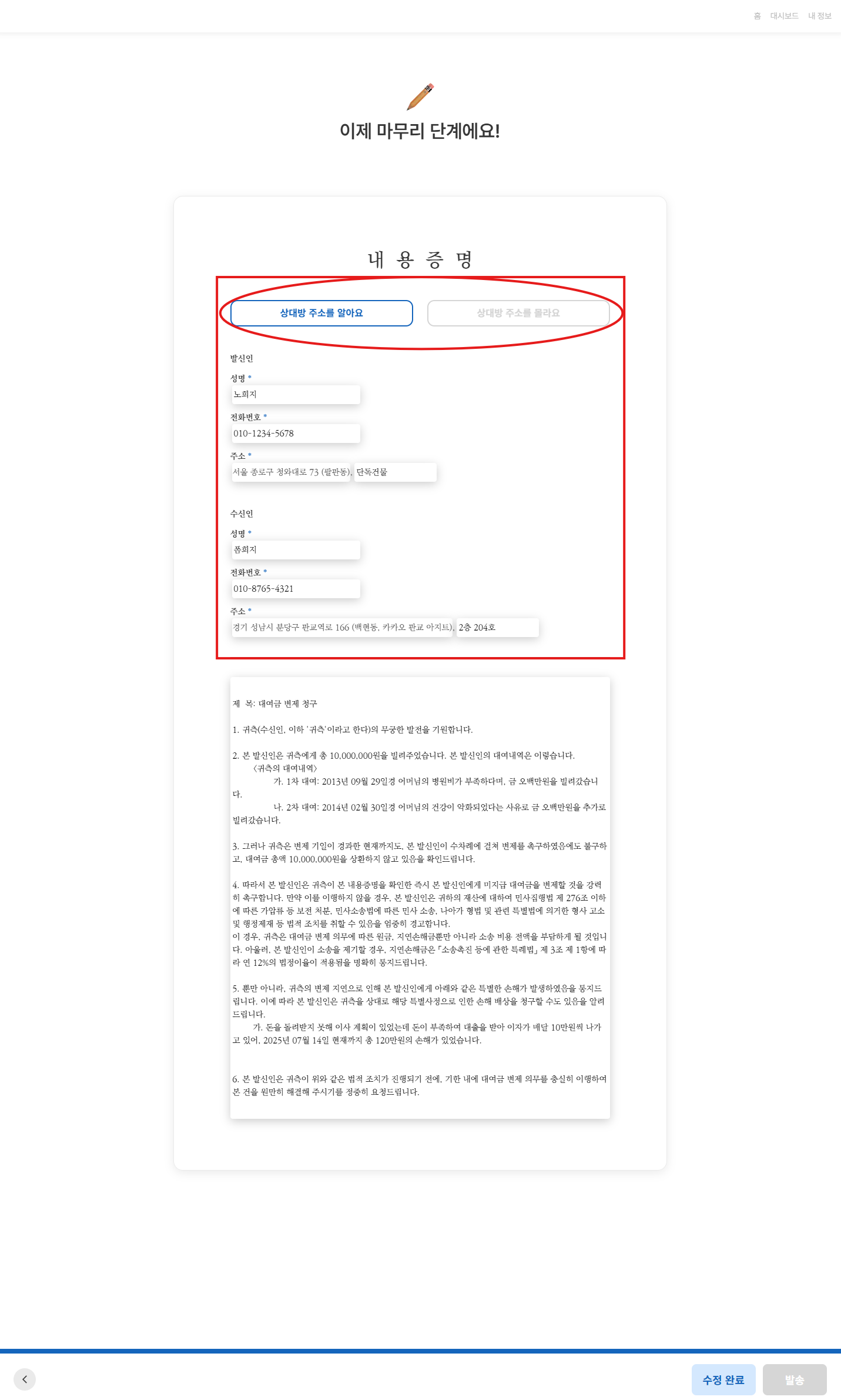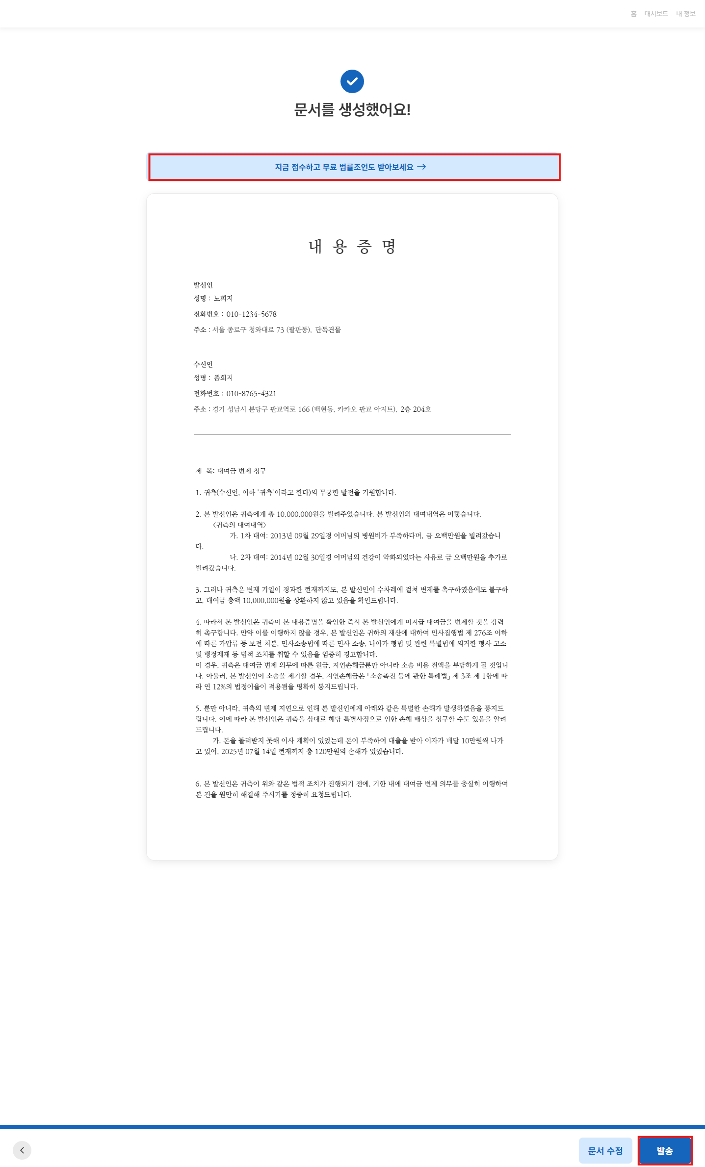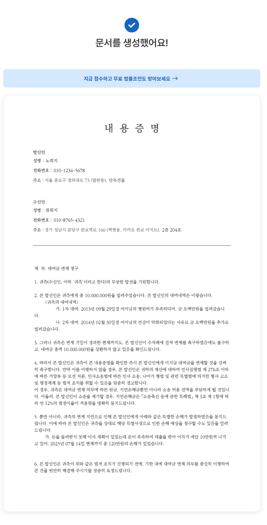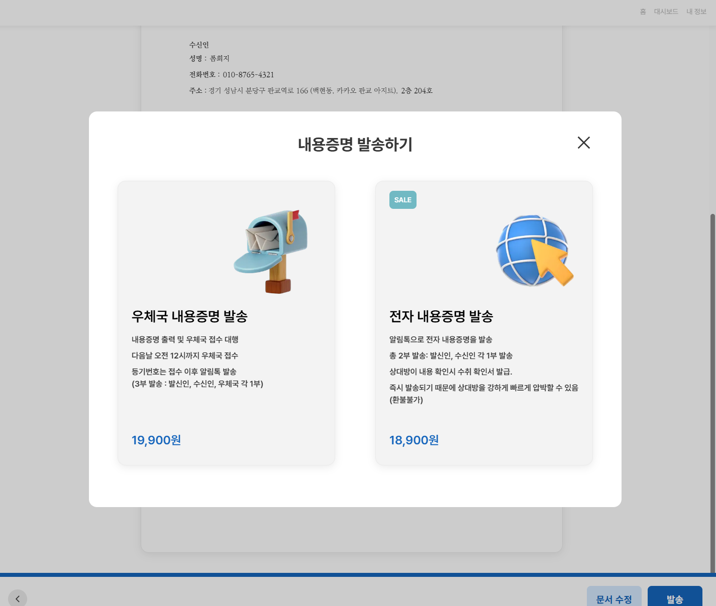 - 전자 내용증명: 전화번호만으로 발송 가능하며, 카카오톡 또는 문자로 전달됩니다.