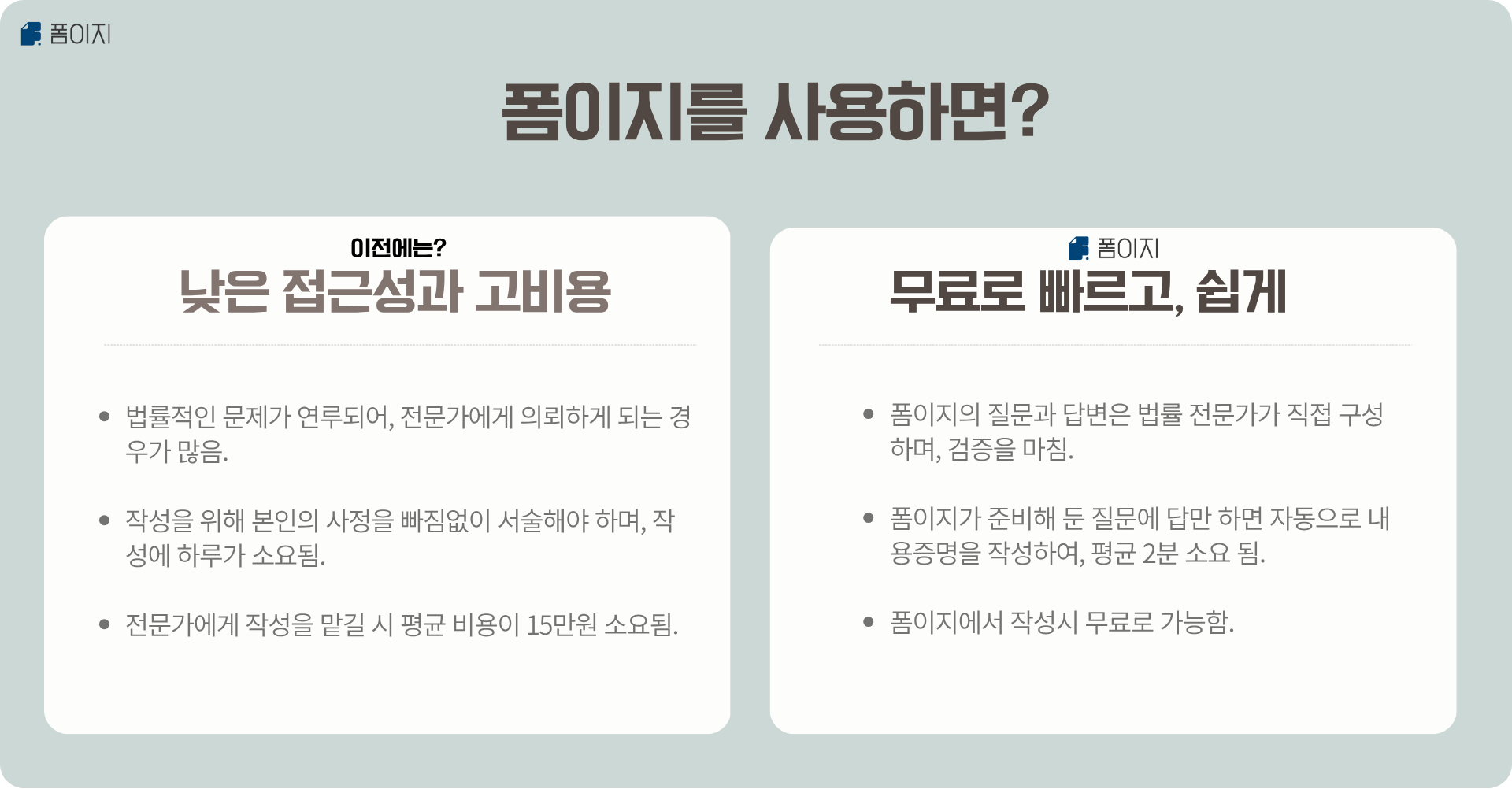 - 전자문서법 제4조 제1항에 의거하여 우체국 내용증명과 동일한 효력을 가집니다. 우체국과 폼이지는 발송했다는 사실만을 증빙하며, 문서의 진실성에 대해 보장하지 않습니다.
